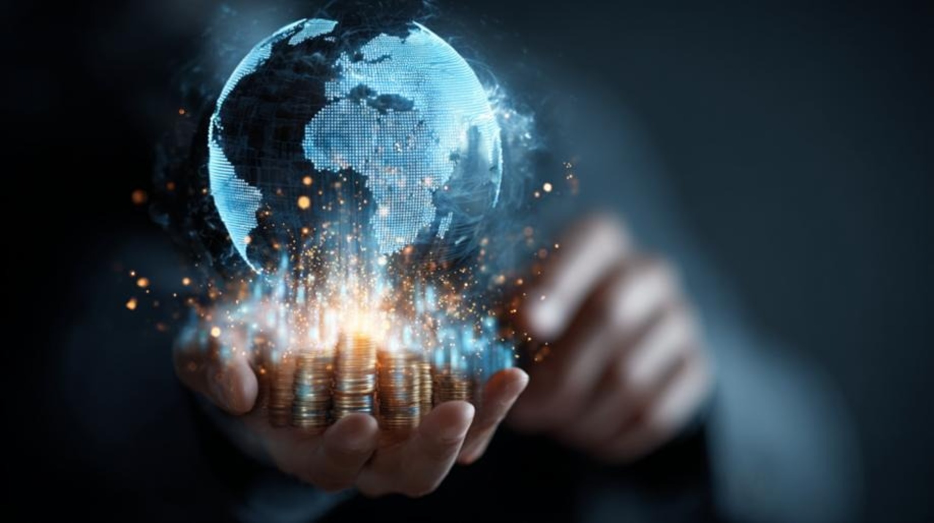 Visual Concept — The Transformation Touch: An entrepreneur’s hand hovers over a glowing touchscreen showing a rotating Earth. Casino chips on her desk morph into shimmering digital stablecoins, spiraling into the globe in blue and gold light. Charts in the background trend upward.
